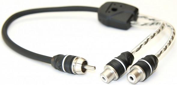 Y-коннектор (2 RCA входа - 1 RCA выход), позволяющий подключать двухканальный усилитель к одному линейному выходу головного устройства/усилителя.